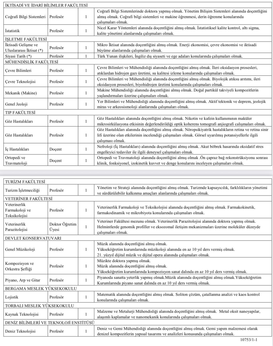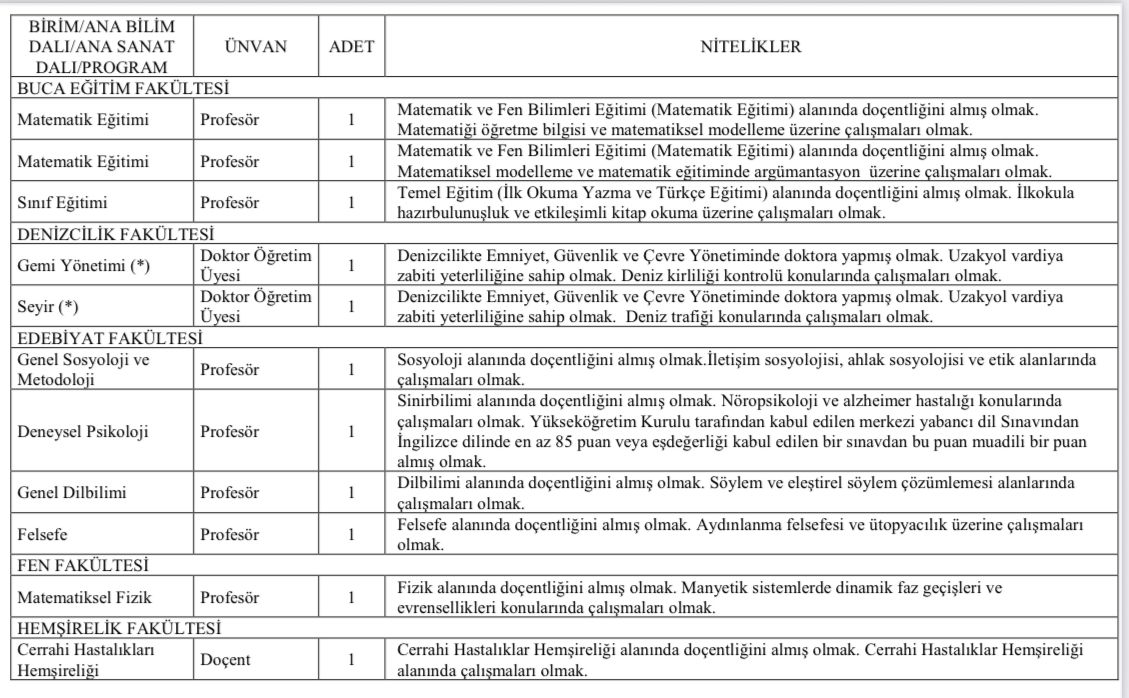 Dokuz Eylül Üniversitesi, çeşitli fakülte ve birimlerinde görev yapmak üzere öğretim üyesi alımı yapacağını duyurdu. Resmî Gazete’de yayımlanan ilana göre üniversite; profesör, doçent ve doktor öğretim üyesi kadrolarına toplamda çok sayıda akademisyen alacak.