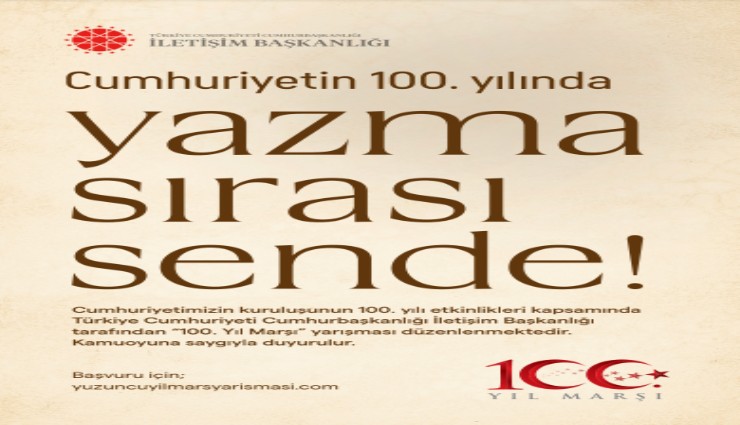İletişim Başkanlığınnın koordinasyonunda düzenlenen Cumhuriyetimizin 100'üncü yıl etkinleri kapsamında "100. Yıl Marş Yarışması" düzenlenecek, yarışmaya başvurular başladı.
