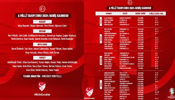 Almanya’nın ev sahipliğinde 14 Haziran-14 Temmuz tarihleri arasında düzenlenecek 2024 Avrupa Şampiyonası (EURO 2024) finallerine katılacak A Mili Takım’ın geniş kadrosu açıklandı.