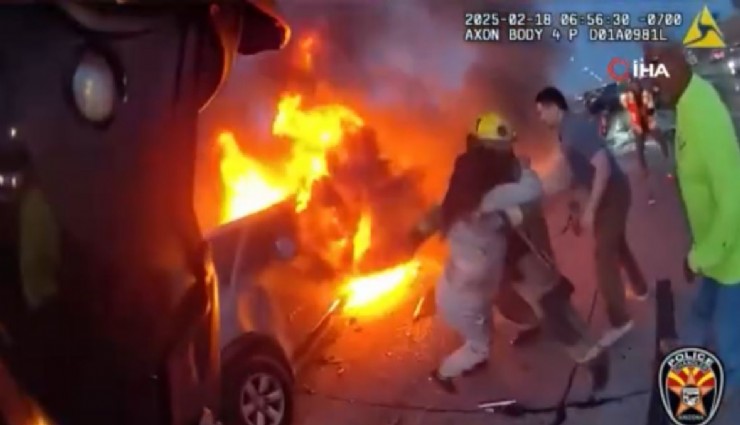 ABD’nin Arizona eyaletinde beton mikserin çarptığı pikap araç devrilerek alev aldı. Hızla olay yerine ulaşan motosikletli polis ve bir itfaiyeci, araçta mahsur kalan sürücüyü kurtarmak için zamanla yarıştı. Polisin aracın camını kırmasının ardından itfaiyeci, kadını saniyeler içinde alev topuna dönen araçtan kurtardı. Kazada yaralanan sürücü sağlık ekipleri tarafından hastaneye kaldırıldı. Sürücüyü kurtaran polis memuru Brian Larison yaptığı açıklamada, kaza anını gördüğünü ifade ederek, "Onun yanmasına izin vermeyeceğim dedim. Üç kez cama vurdum. Camı kırmak sonsuza kadar sürecekmiş gibi geldi. Cam kırıldığı an oksijenin içeri gireceğini ve aracı alevlerin saracağını biliyordum" ifadesini kullandı. O sırada mesai saatleri için olmayan bir itfaiyecinin koruyucu kıyafetlerini giyerek kadını kurtarmaya geldiğini söyleyen Larison, "Tam olarak doğru zamanda, doğru yerdeydi" dedi.