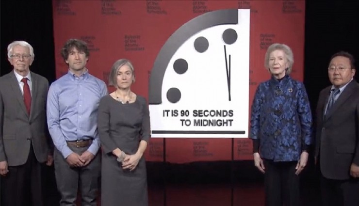 ABD’de bilim insanlarının, insanlığın yok oluşa ne kadar yakın olduğunu göstermek için 1947’de oluşturduğu sembolik Kıyamet Saati, gece yarısına 100 saniyeden 90 saniye kalaya ayarlandı