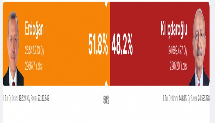 Açılan sandık oranı %96.73: Erdoğan % 51.8, Kılıçdaroğlu: %48.2