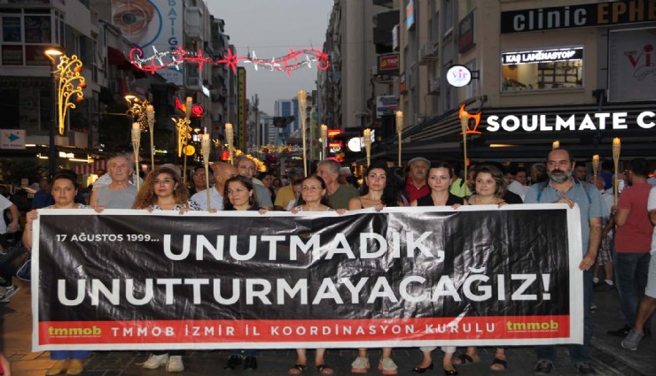 TMMOB İzmir İl Koordinasyon Kuruluyla ve diğer bileşenler tarafından 17 Ağustos 2023 tarihinde Mimarlar Odası İzmir Şubesi önünde sürdürülen Adalet Nöbeti`ne katıldıktan sonra Alsancak Türkan Saylan Kültür Merkezi önüne kadar bir yürüyüş gerçekleştirildi.