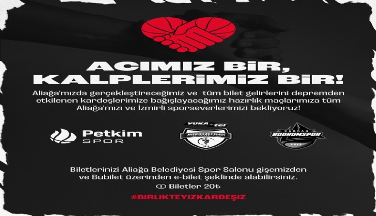Türkiye Sigorta Basketbol Süper Ligi ekiplerinden Aliağa Petkimspor, Merkezefendi Belediyesi Basket ve Çağdaş Bodrum Spor ile oynayacağı hazırlık maçlarının bilet gelirlerini depremzede vatandaşlara bağışlayacağını duyurdu.