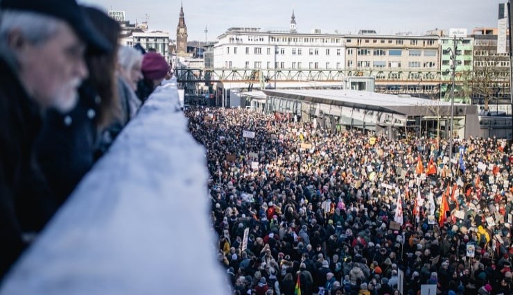 Hamburg, Frankfurt, Hannover, Kassel, Dortmund, Wuppertal, Karlsruhe, Nürnberg, Erfurt ve Almanya’nın diğer şehir ve kasabalarında düzenlenen protesto gösterilerinde binlerce kişi dondurucu havaya rağmen demokrasi yürüyüşü yaptı. Protestolarda taşınan pankartlarda “Faşizm bir alternatif değildir” ifadesi yer aldı.
