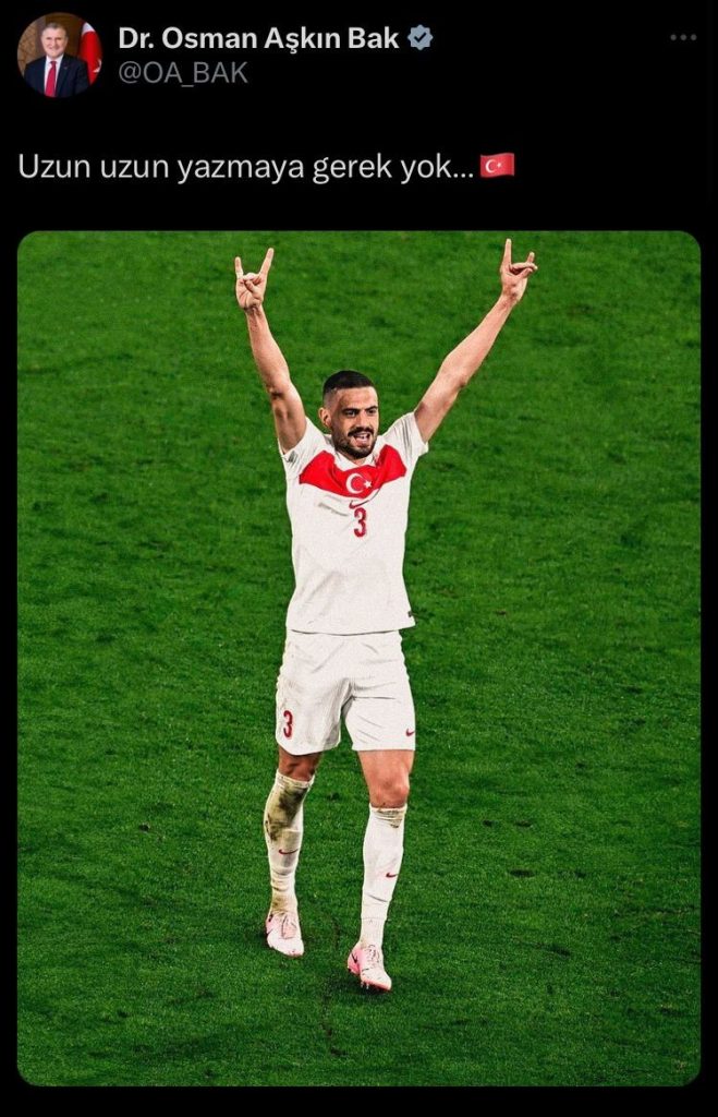 Gençlik ve Spor Bakanı Osman Aşkın Bak, sosyal medya hesabından milli futbolcu Merih Demiral'a destek paylaşımında bulundu.