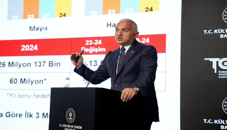 Kültür ve Turizm Bakanı Mehmet Nuri Ersoy, Atatürk Kültür Merkezi’nde düzenlenen toplantı ile 2024 yılı ilk 6 aylık turizm verilerini açıkladı. Bakan Ersoy, yılın ilk 6 ayında 23,7 milyar dolarlık rekor turizm geliri elde edildiğini duyurdu. Bakan Ersoy, turizm gelirlerindeki rekorların sonraki çeyreklerde de görüleceğinin altını çizerek, “Yıl sonu hedefimiz olan 60 milyar doları aşabiliriz” dedi.