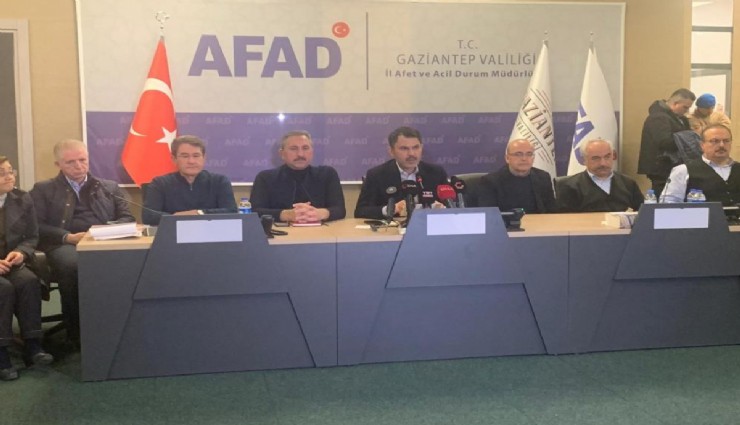 Kahramanmaraş merkezli depremlerde, çok sayıda binanın yıkıldığı ya da hasar gördüğü Gaziantep'e gelen Çevre, Şehircilik ve İklim Değişikliği Bakanı Murat Kurum toplantı düzenledi. Gaziantep AFAD Koordinasyon Merkezi'ndeki toplantıya Bakan Kurum'un yanı sıra, eski bakanlar Mehmet Şimşek ve Abdülhamit Gül, Gaziantep Valisi Davut Gül, İl Emniyet Müdürü Mustafa Emre Başbuğ, İl Jandarma Komutanı Tuğgeneral Hidayet Arıkan, askeri erkan, AFAD yetkilileri ve kurum müdürleri katıldı. Bakan Kurum 10 ilde 307 bin 763 binanın incelendiğini söyleyerek, Cumhuriyet tarihinin en büyük afet konutu seferberliğini başlatarak, 1 yıl içerisinde tamamlayacaklarını ifade etti.