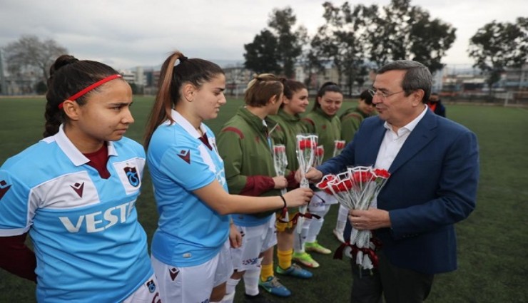 Konak Belediye Başkanı Abdül Batur, Konak Belediyespor - Trabzonspor maçı öncesi, kadın futbolcuların 8 Mart Dünya Kadınlar Günü’nü kutladı.