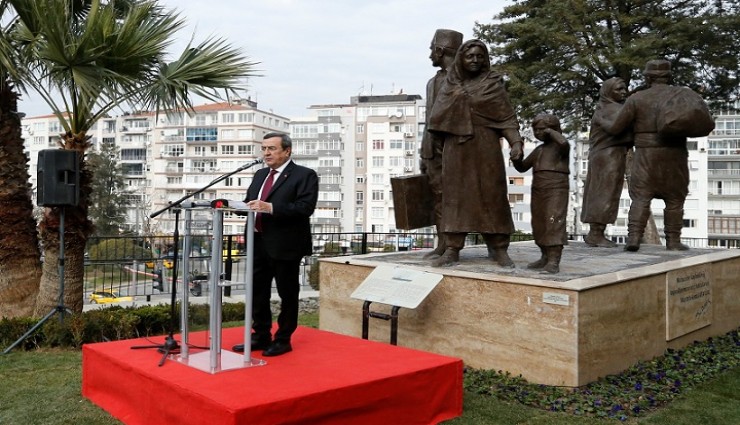 Eşrefpaşa Giritliler Derneği’nden Giritliler Federasyonu adına konuşan Konak Belediye Meclis Üyesi Ali Peynirci de duygusal anlar yaşadığı konuşmasında mübadelenin her iki tarafa da acılar, ızdıraplar yaşattığını belirterek, “Gidenler için de gelenler için de dil, uyum, barınma sorunu oldu ama Büyük Atatürk o dönemde gelen mübadillere sahip çıkmıştır. O acıları yaşayarak bu günlere geldik. Anıtın açılışına ben babamla geldim. Babam anıta bakıp, ‘Şu gördüğünüz anıtta elinde tahta bavulla gelenler tasvir edilmiş. Dedem de Girit’ten Ayvalık’a böyle tahta bir bavulla gelmiş’ dedi. O nedenle heykeltıraşa da o günleri çok güzel anlattığı için, derneğimizin, camiamızın isteğini kırmadığı ve böyle bir anıtı yaptırdığı için teşekkür ederiz” dedi.