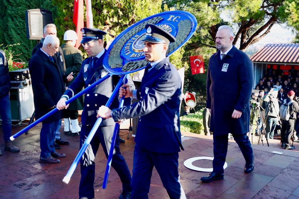 Törende konuşan Menemen Kaymakamı Fatih Yılmaz, “Bir meczup anlayışın hunharca katlettiği kahraman şehitlerimiz, sizleri bugün şereflendirdiğiniz bu görkemli tepede birlik ve beraberlik içinde şükran ve minnetle anıyoruz. Genç Cumhuriyetimize kastetme cüretini gösteren bu menfur anlayışa, gözünüzü kırpmadan bedenlerinizi siper ettiniz. Yüce milletimiz, mukaddes vatanımızın bekası için sizler gibi gözünü kırpmadan canlarını feda eden aziz şehitlerimizi hiçbir zaman unutmayacaktır. Esasen bu menfur anlayışın inanç iklimimizin özünü oluşturan, ‘yaratılmış ne varsa yaradana hürmeten hoş gör, adil davran ve saygı duy’ öğretisinin manevi mimarları Mevlana, Yunus Emre ve Hacı Bektaş-ı Veli ile asla bağdaşmadığı aşikardır. Ulu Önderimiz Mustafa Kemal Atatürk’ün kurduğu ve en büyük eserim dediği Türkiye Cumhuriyeti sonsuza kadar var olacaktır. Bu ülkenin doğulusuyla, batılısıyla, kuzeylisiyle, güneylisiyle kan ve gözyaşları içinde kurduğu, varlığımızın en değerli, biricik nişanesi Cumhuriyetimizi ve onun yüce değerlerini korumak ve kollamak boynumuzun borcudur. Huzur içinde uyuyunuz, emanetiniz Türkiye Cumhuriyeti ilelebet payidar kalmaya devam edecektir. Ruhunuz şad olsun” dedi.