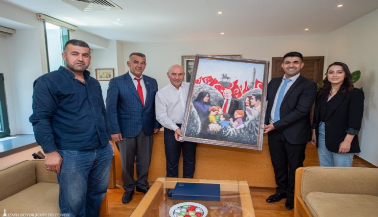 Menemen Ahıhıdır Mahalle Muhtarı Hızır Algül, İzmir Büyükşehir Belediye Başkanı Tunç Soyer’i makamında ziyaret etti. Algül’e azaları ve Umut Işığı Derneği Başkanı Murat Algül de eşlik etti. Başkan Tunç Soyer’e bölgede yaptığı yatırımlar için özel olarak hazırlanan portreyi hediye eden Algül, “Ova yollarımız, diğer yollarımız, hepsi çok güzel oldu. Teşekkür ederiz. Bizi yücelttiniz. 40 seneden beri böyle bir şey görmedik. İzmir, sizinle çok güzel oldu” dedi. Ziyarette üzerinde Tunç Soyer yazan tişört de takdim edildi.