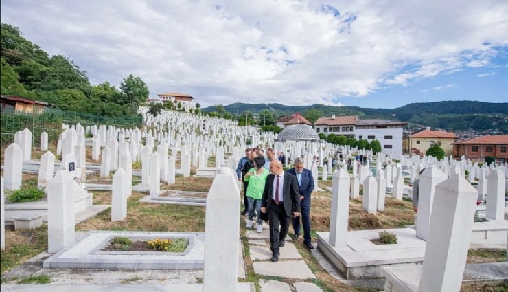 2. Dünya Savaşı'ndan sonra yaşanan bir insanlık trajedisi olan katliamda, Sırp birlikleri temmuz 1995'te 8 bin 372 Boşnak sivili öldürmüştü. 27'nci yıl dönümü programı çerçevesinde anma ve cenaze töreninin düzenleneceği 11 Temmuz'da (bugün), kimlik tespiti yapılan ve ailesinin onay verdiği 50 soykırım kurbanı daha Potoçari Anıt Mezarlığı'na defnedilecek. Yarınki tören öncesi ülkeye gelen Başkan Soyer ve beraberindeki heyetin ilk adresi bağımsız Bosna Hersek’in ilk Cumhurbaşkanı Aliya İzzet Begoviç’in anıt mezarının bulunduğu, soykırımda yaşamını yitiren bin 503 şehit Boşnak'ın da kabrinin yer aldığı Kovaci Şehitliği oldu.
