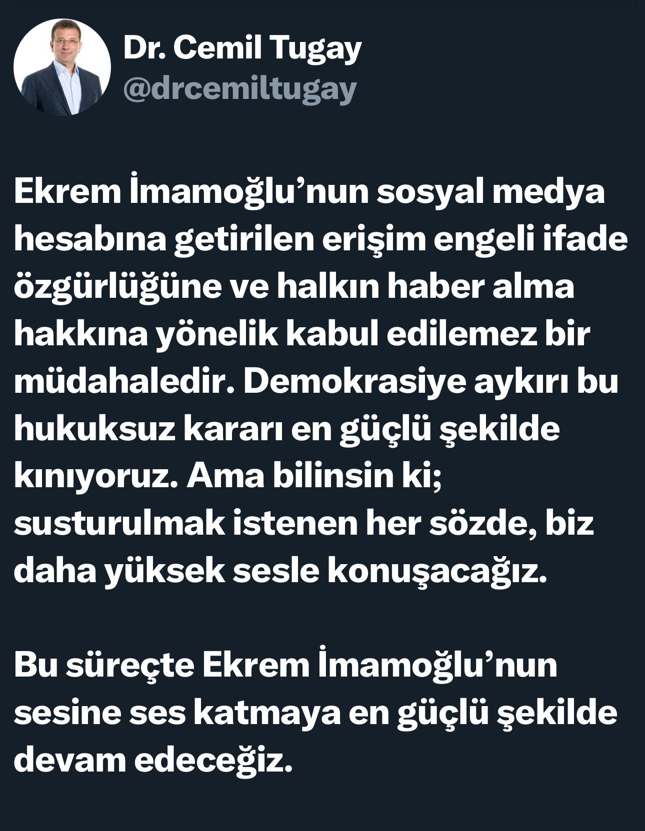 İzmir Büyükşehir Belediye Başkanı Cemil Tugay, Ekrem İmamoğlu'nun X hesabına, erişim engeli getirilmesinin ardından ABB Başkanı Mansur Yavaş gibi, X hesabına Ekrem İmamoğlu fotoğrafı koyarak, "Ekrem İmamoğlu’nun sesine ses katmaya en güçlü şekilde devam edeceğiz" mesajını verdi.