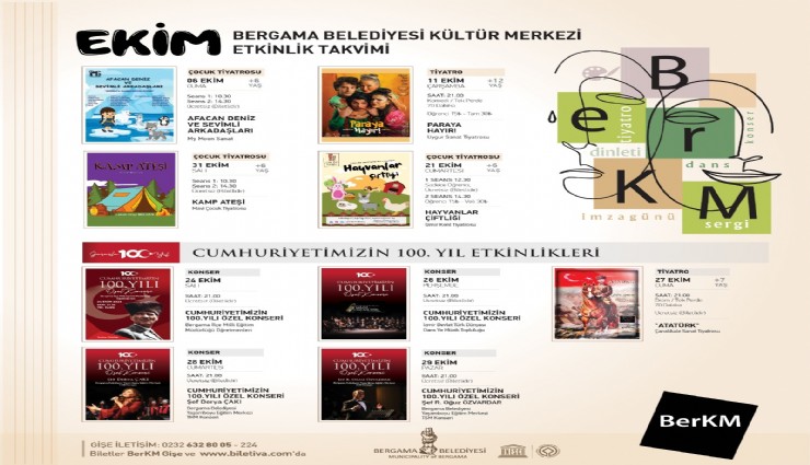 Cumhuriyetimizin 100. Yılına özel etkinliklerin de düzenleneceği BerKM’de konser ve tiyatro gösterileri de yapılacak. Cumhuriyetimizin 100. Yılı Özel Konser serisinde 24 Ekim saat 21.00’de Bergama İlçe Milli Eğitim Müdürlüğü Öğretmenleri, 26 Ekim saat 21.00’de İzmir Devlet Türk Dünyası Dans ve Müzik Topluluğu sahne alacak. 28 Ekim saat 21.00’de Şef Derya Çakı’nın yönetiminde Bergama Belediyesi Yaşamboyu Eğitim Merkezi Türk Halk Müziği konseri, 29 Ekim saat 21.00’de Şef R. Oğuz Özvardar yönetiminde Yaşamboyu Eğitim Merkezi Türk Sanat Müziği konseri verilecek. 27 Ekim saat 21.00’de Çanakkale Sanat Tiyatrosunun “Atatürk” konulu gösterisi sahne alacak.