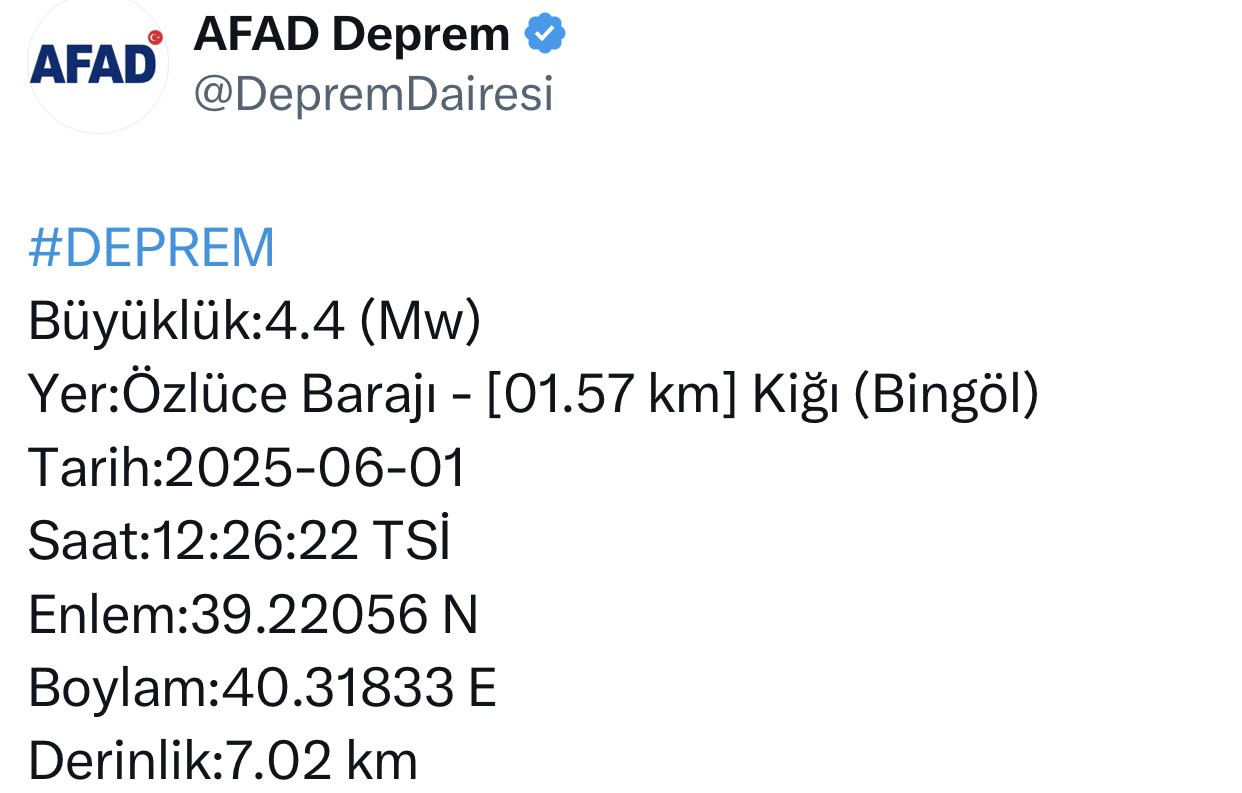 AFAD'dan yapılan açıklamaya göre, saat 12.26'da merkez üssü Bingöl'ün Kiğı ilçesi olan 4,4 büyüklüğünde deprem meydana geldi. Yerin yaklaşık 7 kilometre derinliğinde meydana gelen depremde şimdiye kadar olumsuz bir duruma rastlanmadığı kaydedildi.