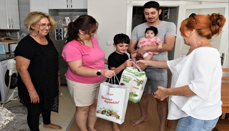Dağıtımlar kapsamında Atatürk Mahallesinde bulunan Tabazik ailesi ve minik Aden, mahalle muhtarı Pakize Namdar ile birlikte ziyaret edildi. Ramazan ve Merve Tabazik ile 9 yaşındaki oğlulları Emir’e mutluluklar dileyen belediye çalışanları, 3 aylık minik Aden’ için de hediyeleri bırakarak, Bornova Belediye Başkanı Dr. Mustafa İduğ’un iyi dileklerini iletti.