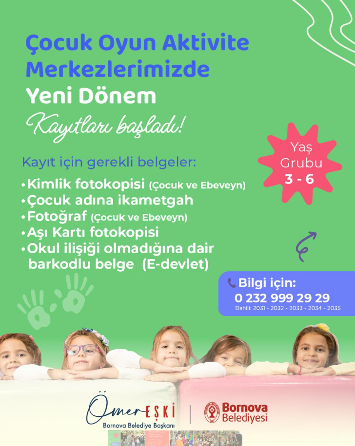 Bornova Belediyesi, 3-6 yaş arası çocuklar için hizmet veren Çocuk Oyun ve Aktivite Merkezleri’nde 2025-2026 eğitim dönemi kayıtlarını açtı; Başkan Ömer Eşki, tüm aileleri bu fırsattan yararlanmaya davet etti.