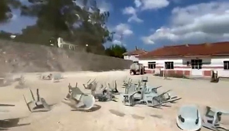 Bursa’nın Yenişehir ilçesinde çıkan hortum korku dolu anlar yaşattı. Etkinlik için meydana koyulan sandalyeler havada uçuşurken, o anlar kameraya yansıdı.