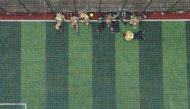 Bursa'da üç ilçeyi etkileyen ve 3 köyün boşaltılmasına sebep olan yangında 12 saat boyunca fedakarca çalışan ve ormanın derinliklerine girip alevleri bastıran itfaiye erleri bir halı sahada istirahate çekildi. Halı sahada zor şartlarda birkaç saatliğine dinlenip yeniden göreve gitmek için hazırlanan itfaiye erleri dikkat çeken görüntüler oluşturdu.