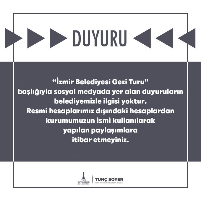 İzmir Büyükşehir Belediyesi Twitter hesabından "İzmir Belediyesi gezi turu" başlığı adı altında yapılan paylaşımların asılsız olduğunu ifade eden duyuru paylaştı.