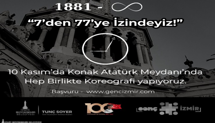 İzmir Büyükşehir Belediyesi, ulu önder Mustafa Kemal Atatürk’ün aramızdan ayrılışının 85. yıldönümünde Konak Atatürk Meydanı’nda 10 Kasım saat 09.05’te “7’den 77’ye İzindeyiz!” yazılı koreografi yapıyor. Katılmak isteyen İzmirliler gencizmir.com adresinden başvurabilir.