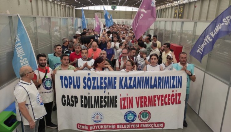 İzmir Büyükşehir Belediyesi, ESHOT ve İZSU genel müdürlüklerinde görevli kamu emekçileri ile bu işyerlerinde örgütlü Tüm Belediye ve Yerel Yönetim Hizmetleri Emekçileri Sendikası (Tüm Bel-Sen) İzmir Şubesi büyükşehir arasındaki toplu iş sözleşmesi görüşmelerinin tıkanması üzerine başlayan eylemler devam ediyor. Kültürpark’ta Holler içinde yürüyüş yapan kamu emekçileri Başkan Tugay’ı toplu iş sözleşmesindeki tutumundan vazgeçmeye çağırdı.