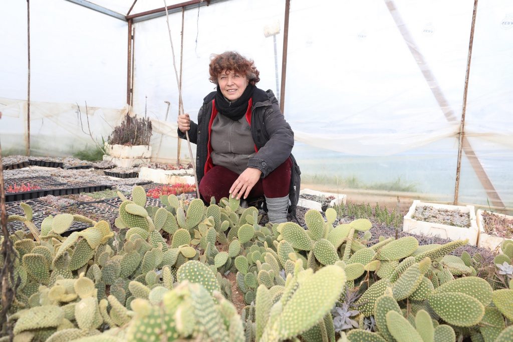 9 ülkeden getirdiği kaktüs türlerini Develi Köyü’ndeki serasında yetiştiren Hörü Mutlu, evinden serasına giderken yolunun üstündeki köpekleri de besliyor.