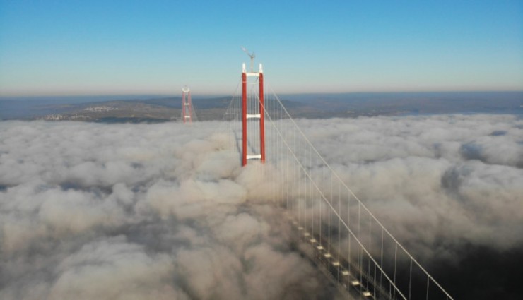 Çanakkale Boğazı yoğun sis nedeniyle transit gemi geçişlerine kapatıldı. 2023 metre orta açıklığıyla dünyanın en uzun orta açıklığa sahip asma köprüsü olan 1915 Çanakkale Köprüsü`nün sis bulutu altındaki hali ise dron ile görüntülendi.