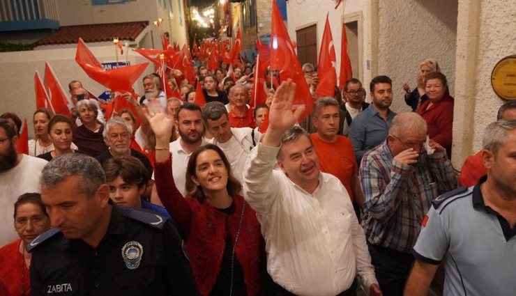 Çeşme Belediyesi tarafından Cumhuriyet’in 100’üncü yıl kutlamaları kapsamında düzenlenen yürüyüş Musalla Mahallesi 16 Eylül Parkı’ndan başladı. Binlerce vatandaş, ellerinde bayraklar ve meşalelerle Cumhuriyet Meydanı’na yürüdü. Çeşme Belediye Başkanı M. Ekrem Oran korteje eşi Nuriş Oran ve oğlu Nazım Çetin Oran ile birlikte katıldı. Meclis üyeleri ve muhtarlar da kortejde yer aldı. Yürüyüş boyunca bando eşliğinde marşlar çalındı. Çeşmeliler balkonlarından bayraklar sallayarak coşkuya ortak oldu.