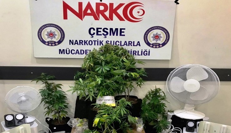 Edinilen bilgiye göre, Çeşme Narkotik Suçlarla Mücadele Grup Amirliği ekipleri ile Çeşme İstihbarat Büro Amirliği ekipleri, L.C. adlı bir kişinin villada düzenek kurarak kenevir bitkisi yetiştirdiğinin bilgisini aldı. Polis ekipleri, daha sonra savcılıktan alınan kararla villada arama yaptı. Yapılan aramada, boyları 80 santimetre ile 1 metre arasında değişen 6 kök kenevir ile 8 kök kenevir fidanı ele geçirildi. 195 gram da esrar maddesinin bulunduğu arama sırasında, 1 adet termal çadır ile kenevir bitkilerinin gelişebilmesi için kullanıldığı düşünülen ısı ve ışık yayan ampul, led ampul, akım düzenleyici cihaz, termometre, vantilatör, buhar makinası, turbo fan, asit ölçer ve çok miktarda gübreye el konuldu.