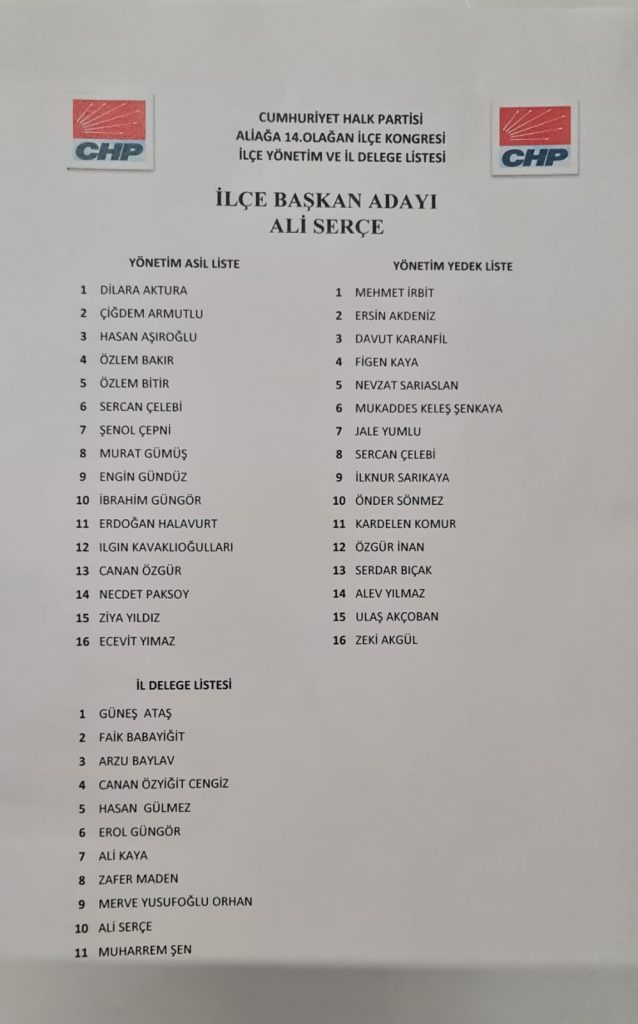 CHP Aliağa İlçe kongresinde Meclis Başkanı Avukat Hakan Turan ile esnaf Ali Serçe yarıştı. Serçe, toplam kullanılan 251 oyun 147'sini alarak ilçe başkanı seçildi. Rakibi olan Turan ise 104 oy aldı.