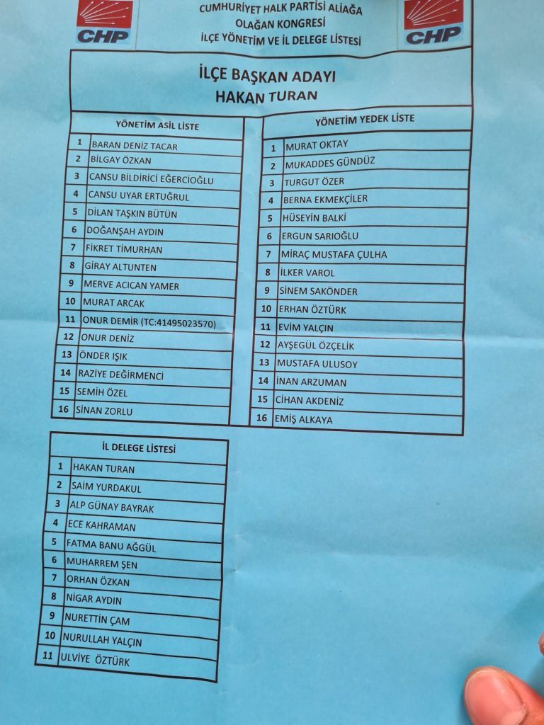 CHP Aliağa eski İlçe Başkanı, İl Yönetim Kurulu üyesi Özcan Durmaz ile son İlçe Başkanı Özlem Şan Oğuzhan’ın Hakan Turan’a destek verdiği biliniyor.