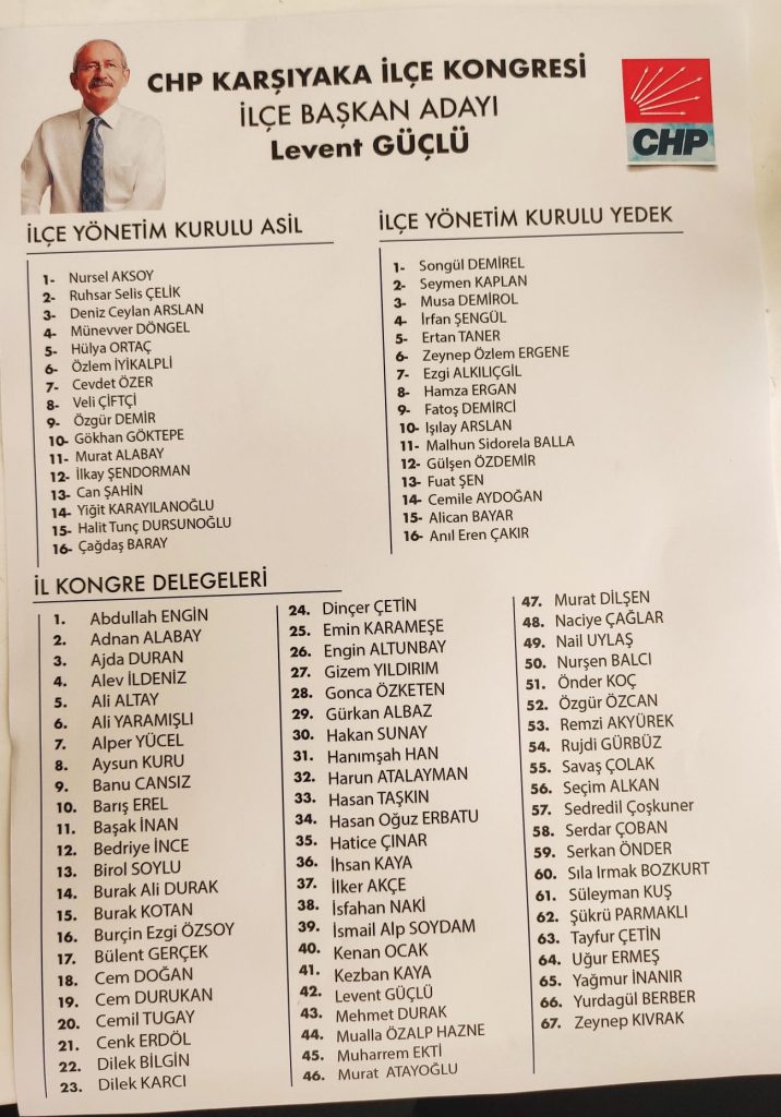 İlçe başkan adayı olarak konuşmasını gerçekleştiren ilçe başkan adayı Levent Güçlü, "Ben bu örgütün istediğinde neler yapabileceğini biliyorum. 18 yıl mahalle muhtarlığı yaptım. CHP’yi 2020 yılında gönülden bağlandım o günde bugüne partim için çalıştım. Ben Mustafa Kemal Atatürk’ün neferiyim. Irkçılık, mezhepçilik bilmem. Bütün örgütü birleştirmek için buradayım. Emeğe saygı ilkesi ile emekçi örgüt büyüklerimizin bilgilerinden faydalanmak için buradayım. Karşıyaka’dan çıkan bu gücü genel merkeze iletmek için buradayım. 6 okun her ilkesine sahip çıkmak için buraydım.Söz veriyorum, göreve başladığımız andan itibaren ilçe başkanlığımızda kapalı kapı olmayacak. Kulis dedikodu yerine halk meclisi oluşturacağız. Söz veriyorum, yaptığımız her işi aylık bilanço raporları ile askıya çıkaracağız. Kavgamız birbirimiz ile değil, gençlerimizin hayallerini yıkan kadın haklarını yok sayan, halkımız fakirliğe muhtaç eden AKP iktidarıyladır!" dedi.