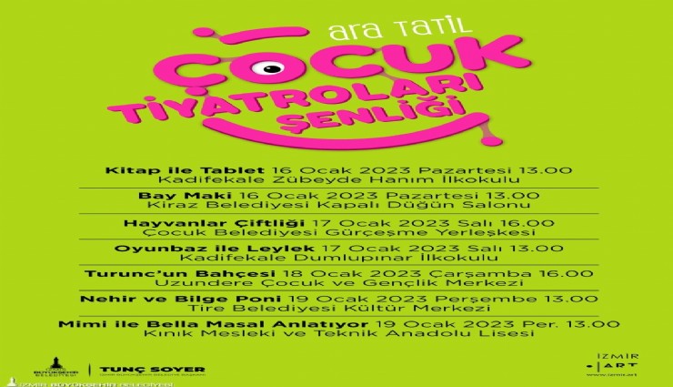 İzmir Büyükşehir Belediyesi, çocukları ara tatilden önce ücretsiz tiyatro gösterileri ile buluşturacak. Ara Tatil Çocuk Tiyatroları Şenliği kapsamında sergilenecek oyunlar, her gün aynı anda farklı sahnelerde olacak. Şenlik 16 Ocak Pazartesi günü saat 13.00’te Kadifekale Zübeyde Hanım İlkokulu’nda “Kitap ile Tablet”, Kiraz Belediyesi Kapalı Düğün Salonu’nda “Bay Maki” adlı tiyatro oyunları ile başlayacak.