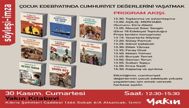 Varyant Yayınları, Cumhuriyet değerlerinin çocuk edebiyatı yoluyla yaşatılmasını amaçlayan proje kapsamında bir seri kitap yayımladı. Seride yer alan sekiz kitabın yazarları, 30 Kasım 2024 Cumartesi günü Alsancak'taki Yakın Kitabevinde okurlarıyla buluşarak kitaplarını imzalayacak ve söyleşecek.