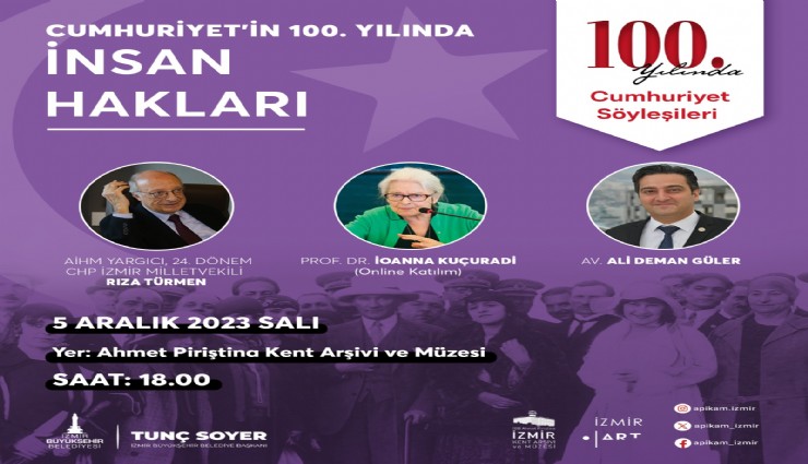 İzmir Büyükşehir Belediyesi tarafından düzenlenen Cumhuriyet Söyleşileri “Cumhuriyetin 100. Yılında İnsan Hakları” başlığı ile devam ediyor. 5 Aralık 2023 Salı günü saat 18.00’da Apikam’da düzenlenecek söyleşinin konukları Prof. Dr. İoanna Kuçuradi (online katılım), AİHM Yargıcı ve 24. Dönem CHP İzmir Milletvekili Rıza Türmen ve Avukat Ali Deman Güler olacak.