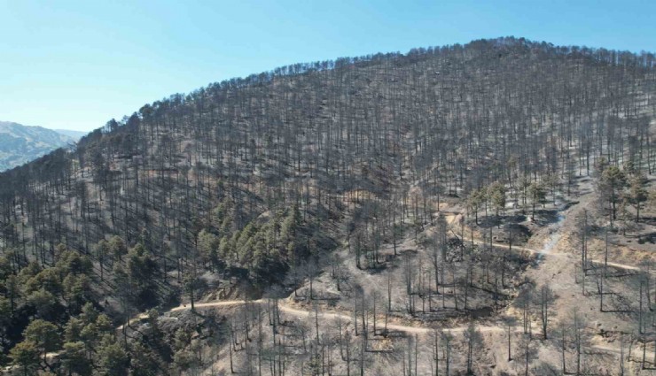 Orman yangını sonucu çalışmaların tamamlandığı orman sahası İhlas Haber Ajansı (İHA) dronu ile havadan görüntülendi. Yanan onlarca hektarlık alan siyaha büründüğü görüldü. Görüntülerde içler acısı manzara oluşurken, alevlerden dolayı yanan ağaçlar simsiyah görüntü oluşturdu.