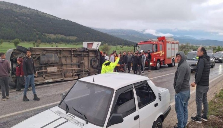 Denizli’nin Tavas ilçesinde tekstil işçilerini taşıyan minibüs, kontrolden çıkması sonucu refüjü aşarak karşı şeritteki seyir halinde olan otomobil ile çarpıştı. Çarpışma sonucu minibüs devrilirken, 1’i ağır 13 kişi yaralandı.