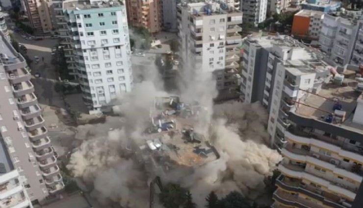 Adana’da depremde ağır hasar alan Ezgi Apartmanı'nın yıkılma anı havadan görüntülendi.