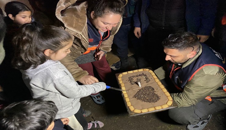 Kahramanmaraş merkezli deprem sonrası İzmir’den deprem bölgesine hareket eden Konak Nevvar Salih İşgören Eğitim Kampüsü-5 Mesleki Teknik Anadolu Lisesinin mutfak ekibi, Kahramanmaraş’ın Türkoğlu ilçesi Kınılı Mahallesi’ndeki afet çadırında depremzedelere yemek yapıyor. Ekip, depremde evleri yıkılan ve ailesiyle çadırda kalan 9 yaşındaki Gülsima Güler’e doğum günü sürprizi yaptı. Mehmet Dayıoğlu, Duygu Dayıoğlu, Zeki Birkan Uz, Nasuh Dumlupınar ve Serdar Bozkurt’tan oluşan mutfak ekibi önce pastayı özenle hazırladı, ardından çadır alanına giderek Gülsima’ya sürpriz yaptı. Gülsima, pastadaki mumu üflerken dilek de tuttu. O anlar, mutfak ekibinin cep telefonu kameralarına yansıdı.