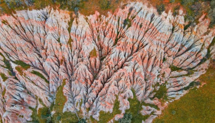 Aydın’ın Sultanhisar ilçesinde sahip olduğu kırmızı, kahverengi ve gri tonlarıyla gökkuşağına benzetilen ve “Aydın’ın Kapadokyası” olarak anılan renkli peri bacaları görenleri şaşırtıyor.