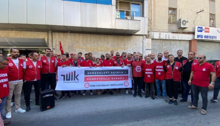 DİSK üyesi İşçiler, İzmir'de TÜİK Ege Bölge Müdürlüğü önünde toplanarak açıklanan enflasyona tepki gösterdi. DİSK Ege Bölge Temsilcisi Memiş Sarı gerçekleştirdiği açıklamasında ,” TÜİK artık Cumhurbaşkanı İstatistik Kurumudur” dedi