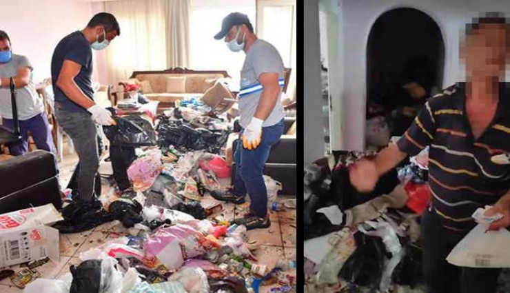 Çöplerden dolayı dairenin kapısının da zor açıldığı görülürken, içeri giren temizlik personeli şaşkınlık yaşadı. İlaçlama yapılarak çöpler poşetlerle kamyona yüklendi.
