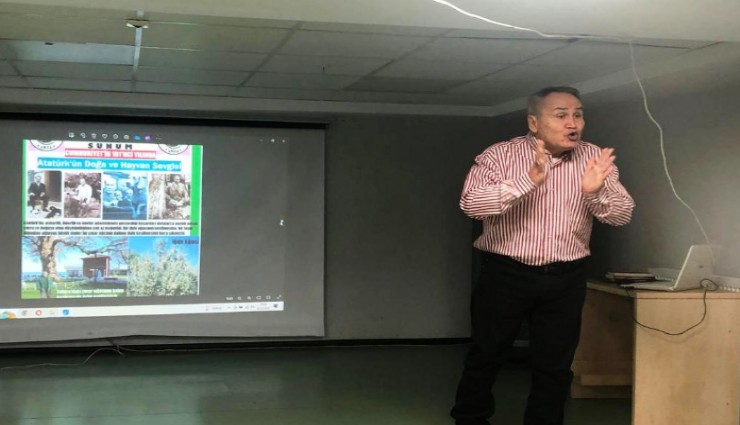 120 kişilik 4’ncü sınıf öğrencilerine görsellerle iki ayrı sunum yaparak Atatürk’ün gençlik yıllarından itibarın ağaçlara, ormanlara, yeşilliğe, hayvanlara olan sevgisini harbiyeden arkadaşı Ali Fuat Cebesoy, Atatürk üzerine araştırmalar yapan Yazar, Gazeteci, Devlet Sanatçısı Nezihe Araz, manevi kızı Sosyolog, Tarihçi Prof. Dr. Afet İnan, Türkiye’nin ikinci Cumhurbaşkanı İsmet İnönü’nün anılarından derlediği bilgileri aktardı. Bir iğde ağacının kesilmesine, bir tayın ölümüne ağlayan büyük önderin 94 yıl önce ulu bir çınar ağcının dalını dahi kesitirtmeyip yaşadığı evi ağaçtan uzaklaştırdığını dile getiren Gazeteci Ahmet Aydın Akansu şunları anlattı: