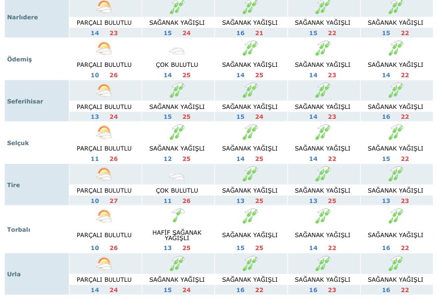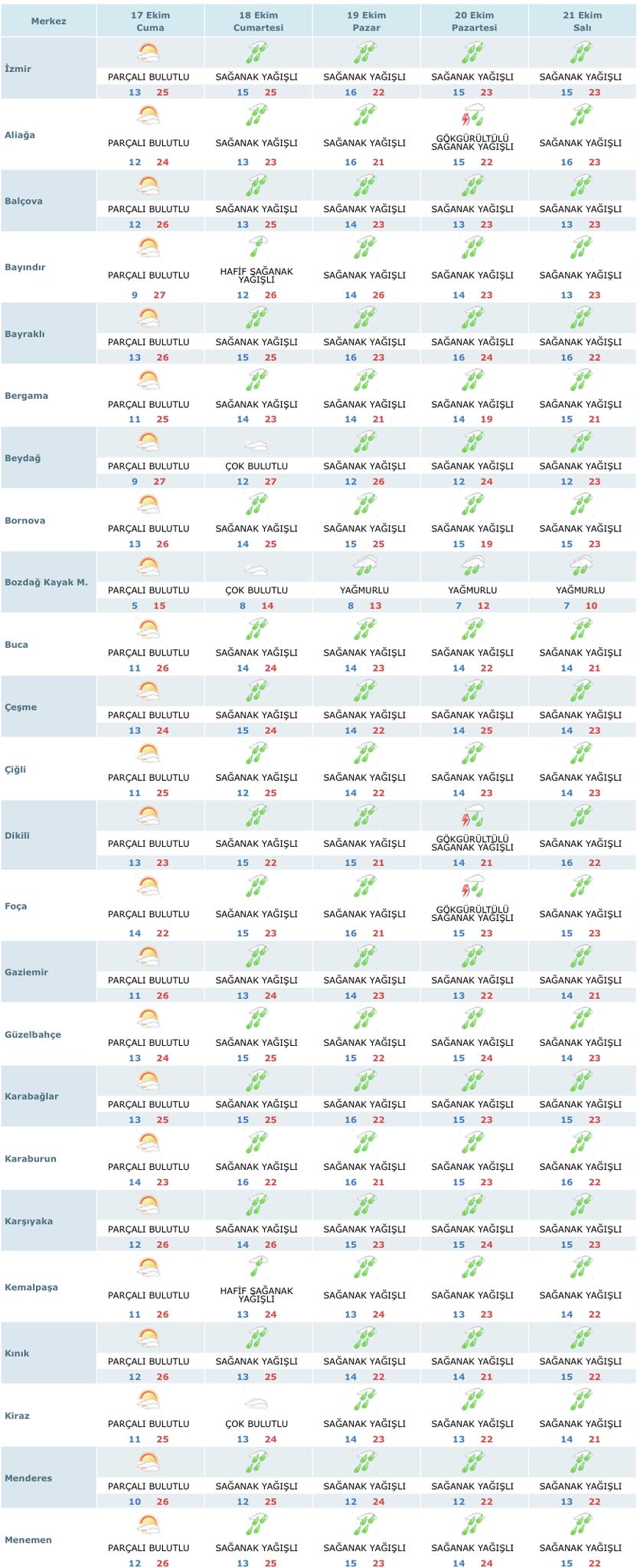 İzmir genelinde hafta sonuyla birlikte yağışlı hava etkili olacak. Cuma günü parçalı bulutlu geçmesi beklenen kentte, Cumartesi gününden itibaren sağanak yağışlar başlayacak.