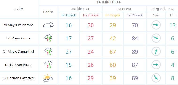 Aydın'da yeni hafta da 30 Mayıs Cuma, 31 Mayıs Cumartesi ve 1 Haziran Pazar günü hava gök gürültülü ve sağanak yağışlı olacak. Ortalama sıcaklık ise 25 derece olacağı tahmin edilirken Cuma ve Cumartesi günü kuvvetli gök gürültülü sağanak yağış beklentisi var. Pazar günü ise yağış etkisini azaltarak devam edeceği tahmin ediliyor.