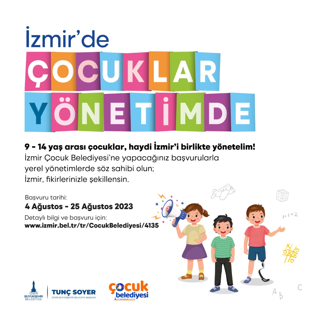 İzmir Büyükşehir Belediyesi kentte yaşayan çocukları yerel yönetim mekanizmalarına dâhil edecek İzmir Çocuk Belediyesi’ni faaliyete geçiriyor. Sosyal Projeler Dairesi Başkanlığı Çocuk Belediyesi Şube Müdürlüğü tarafından yürütülecek çalışmalar kapsamında İzmir Çocuk Belediyesi’ne başvurular başladı. İzmir’de yaşayan 9-14 yaş aralığındaki tüm çocuklar 25 Ağustos tarihine kadar http://www.izmir.bel.tr/tr/CocukBelediyesi/4135 adresinden başvuru yapabilecek. 26 Ağustos’ta yapılacak kura çekimiyle İzmir Çocuk Belediyesi üyeleri belirlenecek.