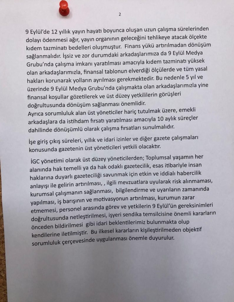 TGS açıklamasında, "İGC yönetimi geçen hafta İzmir Şube Başkanımız Nil Kahramanoğlu ile İşyeri Temsilcimiz Kazım Bozkurt’u görüşmeye çağırarak, kıdemli çalışanlarla yollarını ayıracakları ifade etmişlerdi. Şube Başkanımız, bu tavrın doğru olmayacağını, işten çıkarma dışında çözüm yollarının bulunabileceğini, üyelerimizin işten atılmasına seyirci kalmayacağımızı iletmişti. Ancak görüyoruz ki İGC yönetimi uyarılarımızı dikkate almayarak, bildiğini okumaya devam etmektedir. Dün işyeri duvarlarına asılan imzasız yazı ile üyelerimiz hedef alınmaktadır. Yazıda kıdem yükünden bahsedenler, yeni işe alacakları emekli ve ihtiyacı olan gazetecileri 10’ar aylık sözleşmeler ile çalıştırmayı hedeflemektedir. Genç gazeteciler için okul olmakla övünen 9 Eylül, görünen o ki, bundan böyle mevsimlik gazetecilerin çalıştığı bir kuruma dönüşmek istemektedir. Öte yandan gelen tepkilerden sonra asılan karar metnini kaldırıp ‘revize’ etmek bu gerçeği değiştirmeyecek" ifadeleri de yer aldı.