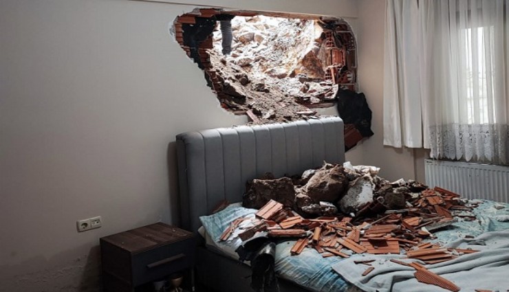 İzmir'in Konak ilçesinde bir inşaatın temel kazma çalışmaları esnasında kazı yapan iş makinesi, başka bir evin duvarını deldi. Olay anında evde bulunan ev sahibi ise yaşadığı korku dolu anları anlattı.